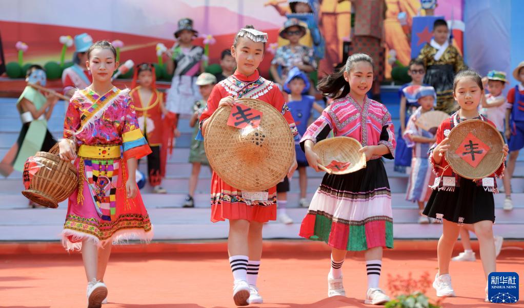 5月31日,在廣西桂林市龍勝各族自治縣龍勝小學(xué),學(xué)生參加環(huán)保服裝秀。