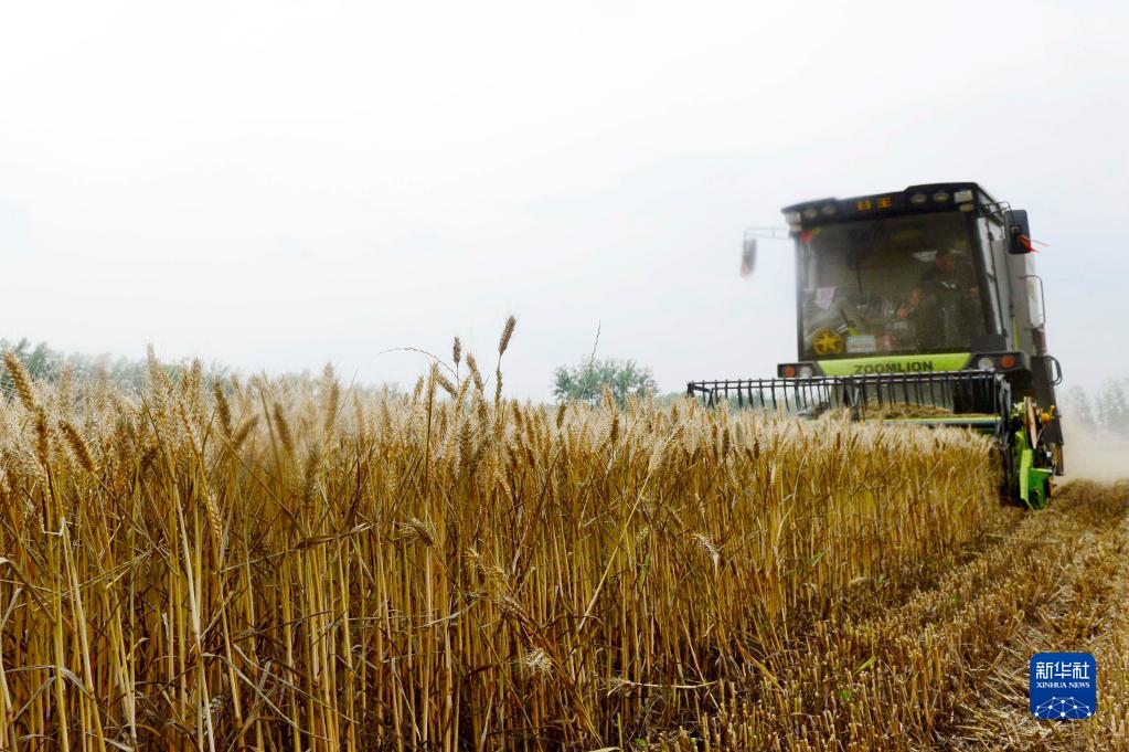 5月31日,在河南省駐馬店市汝南縣宿鴨湖街道白廟社區的麥田里,收割機在搶收小麥。