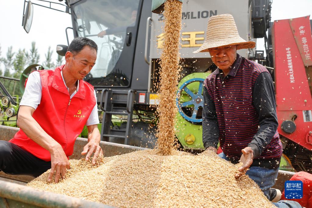 5月31日,河南省開(kāi)封市尉氏縣南曹鄉的黨員志愿者在幫助農戶(hù)搶收小麥。