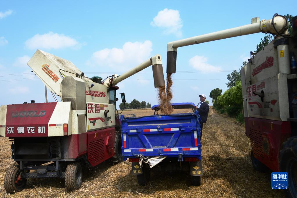 5月31日,農機在河南省南陽(yáng)市臥龍區謝莊鎮王營(yíng)村的麥田里收割小麥。