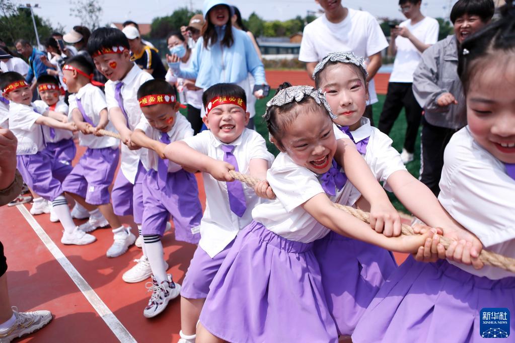 6月1日,山東省青島市即墨區書(shū)香小學(xué)的學(xué)生參與拔河比賽。