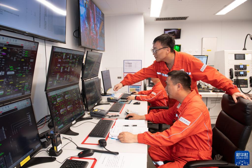 6月1日,在中國海油恩平15-1原油鉆采平臺上的中控室,工作人員查看二氧化碳回注情況。