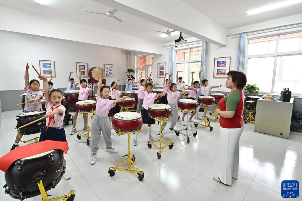5月31日,中關(guān)村第三小學(xué)雄安校區的音樂(lè )老師高向紅(右)指導中國鼓社團的學(xué)生排練。