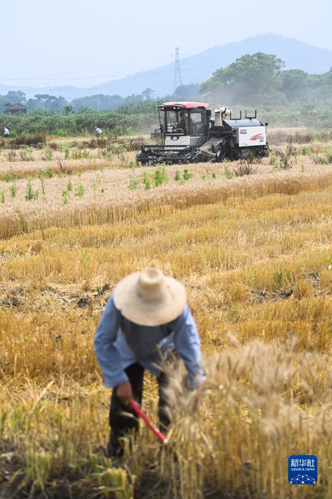 6月1日,在道場(chǎng)鄉施家橋村的麥田里,收割機在抓緊搶收小麥。