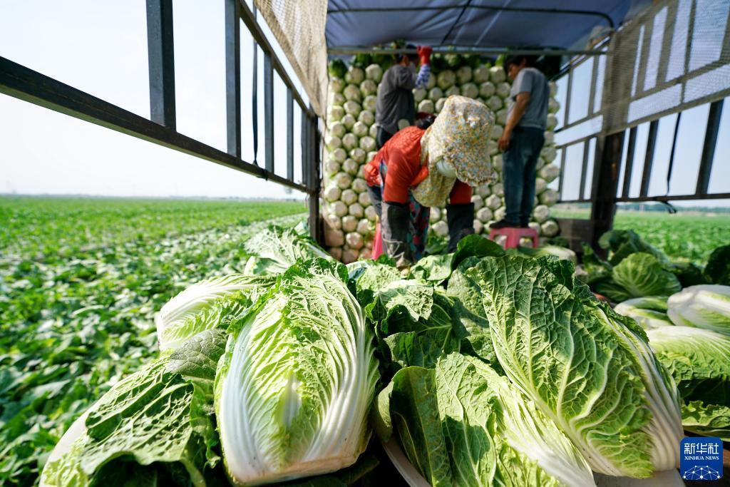 6月1日,農民在河北省玉田縣亮甲店鎮一處供京蔬菜基地內將收獲的白菜裝車(chē)。