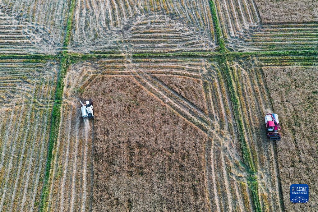 5月31日,在貴州省貴陽(yáng)市開(kāi)陽(yáng)縣宅吉鄉堰塘村,農民駕駛收割機在高標準農田里收割小麥(無(wú)人機照片)。