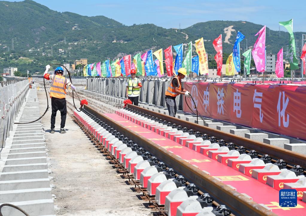 6月1日,中國中鐵電氣化局施工人員在福州濱??炀€(xiàn)首占西高架鋪設軌排。