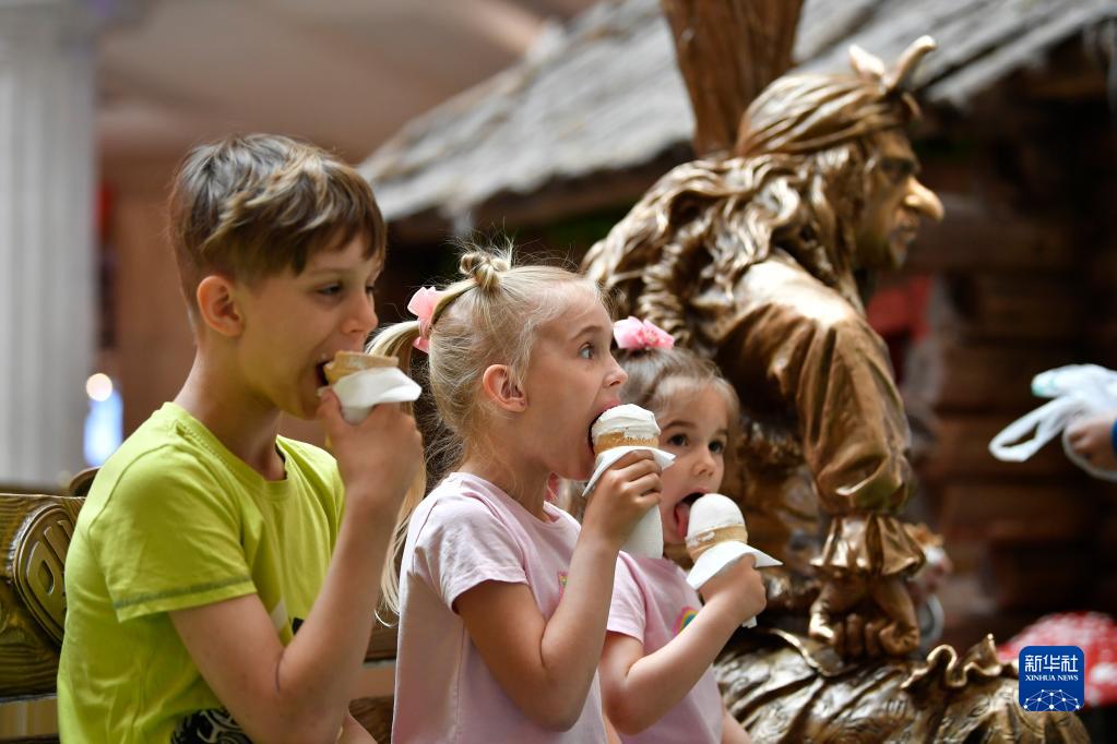 6月1日,孩子們在位于俄羅斯莫斯科市中心的中央兒童商場(chǎng)品嘗冰淇淋,慶?!傲弧眹H兒童節。