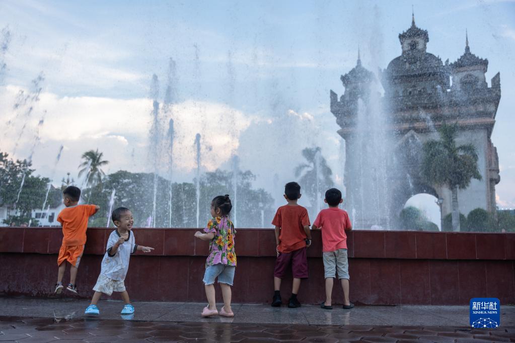 6月1日,孩子們在老撾首都萬(wàn)象的凱旋門(mén)邊觀(guān)賞噴泉,慶?!傲弧眹H兒童節。