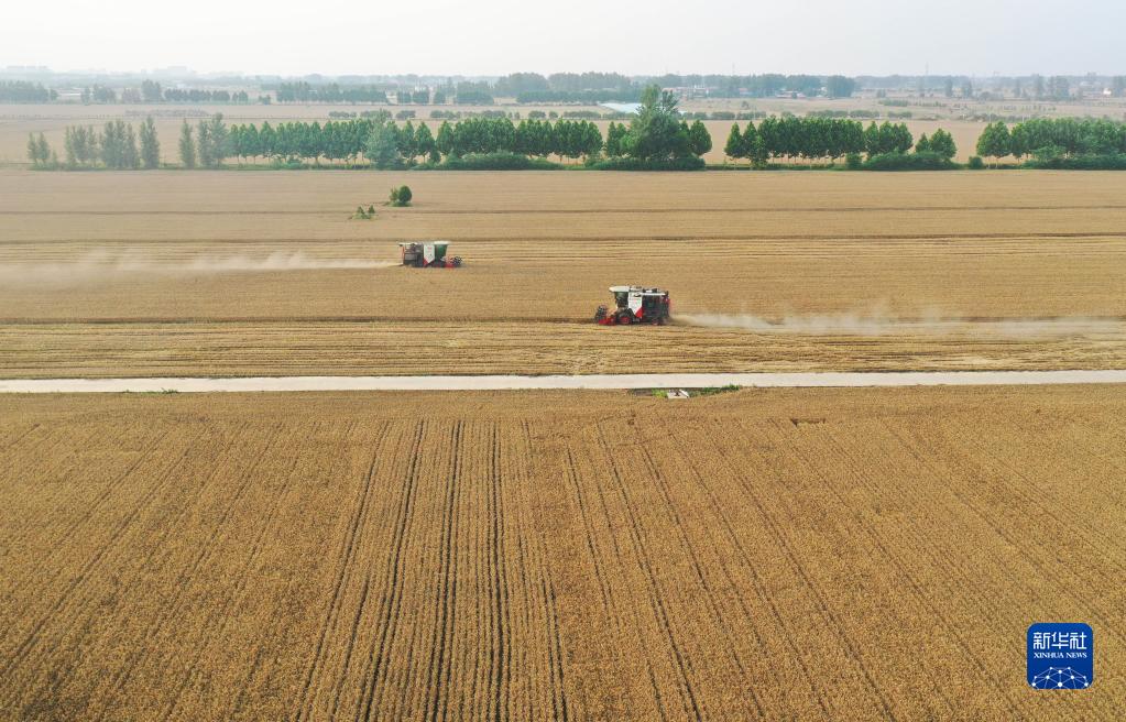 6月1日,在河南省駐馬店市上蔡縣邵店鎮后楊村,收割機在搶收小麥(無(wú)人機照片)。新華社記者 張浩然 攝