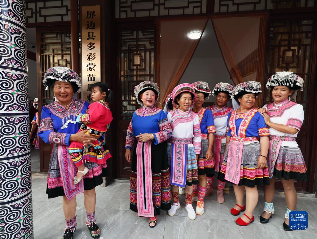 6月1日,繡娘在屏邊繡莉豐鄉民族工藝制品廠(chǎng)門(mén)前合影。