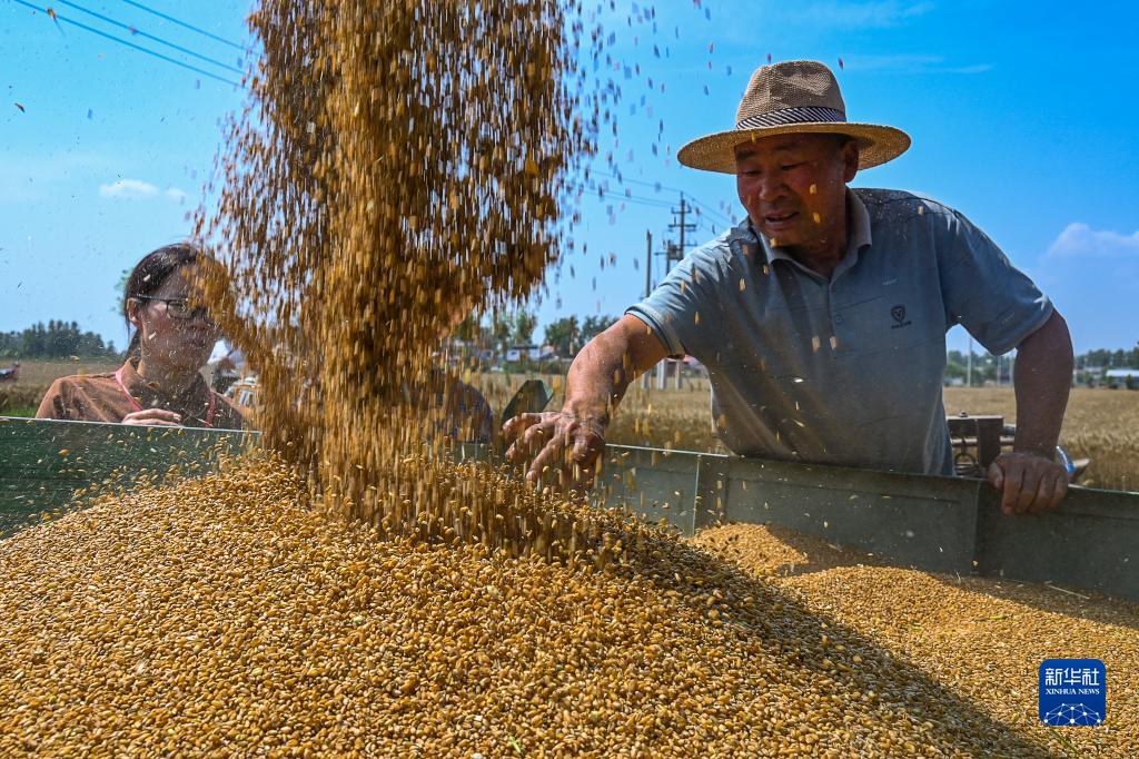 6月1日,河南省漯河市源匯區問(wèn)十鄉農民從收割機上卸下剛收獲的麥粒。
