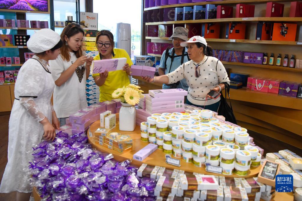 在新疆伊犁哈薩克自治州伊寧縣天山花海國家農業(yè)產(chǎn)業(yè)園,游客在服務(wù)中心選購特色產(chǎn)品(5月18日攝)。