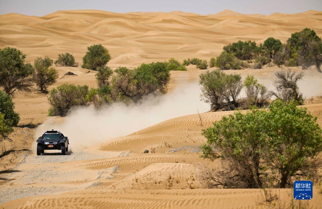 參與2023年中國環(huán)塔(國際)拉力賽的車(chē)手駕駛賽車(chē)疾馳在新疆和田地區墨玉縣的沙漠中(5月28日攝)。?
