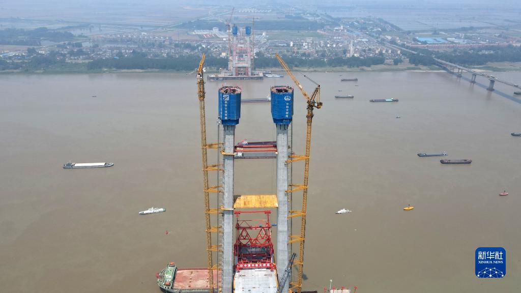 6月2日拍攝的封頂后的京臺高速銅陵長(cháng)江公鐵大橋4號主塔(無(wú)人機照片)。