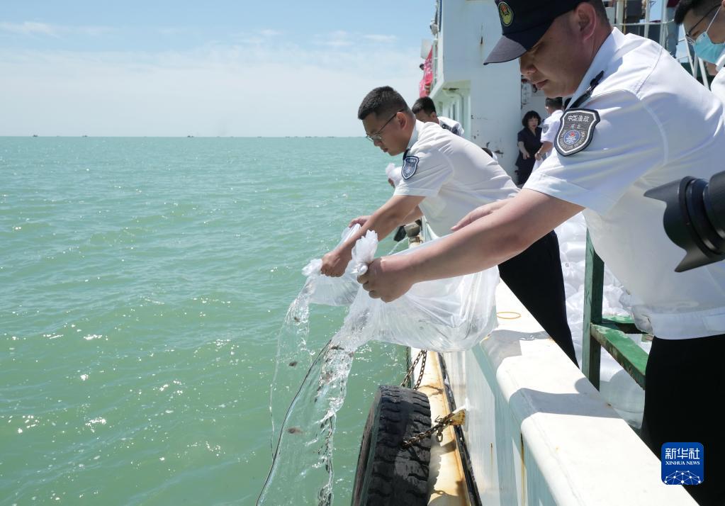 6月2日,參加增殖放流活動(dòng)的人員在秦皇島市北戴河新區海洋漁業(yè)資源增殖放流基地海域投放魚(yú)苗。