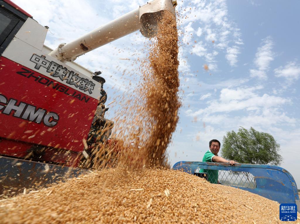 6月2日,在安徽省亳州市蒙城縣小辛集鄉芡河村,農民從收割機上卸下剛收獲的小麥。