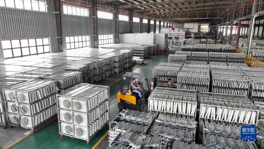 6月2日,工人在柳江區一家空調企業(yè)鈑金倉庫里轉運剛下線(xiàn)的空調零部件(無(wú)人機照片)。