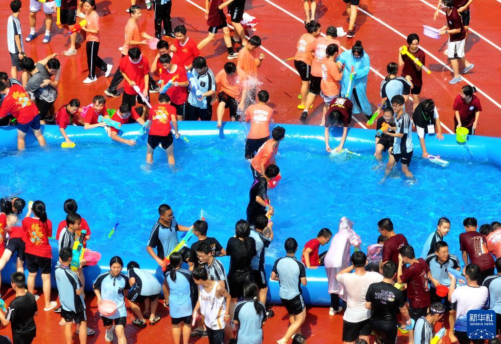 6月2日,學(xué)生們享受潑水活動(dòng)帶來(lái)的快樂(lè )(無(wú)人機照片)。