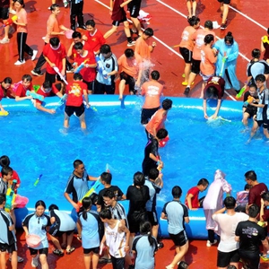 當日,廣西南寧市第三中學(xué)初中部青秀校區組織1500多名初三學(xué)生,在校園舉行潑水活動(dòng),以獨特方式讓學(xué)生們減輕考前壓力。