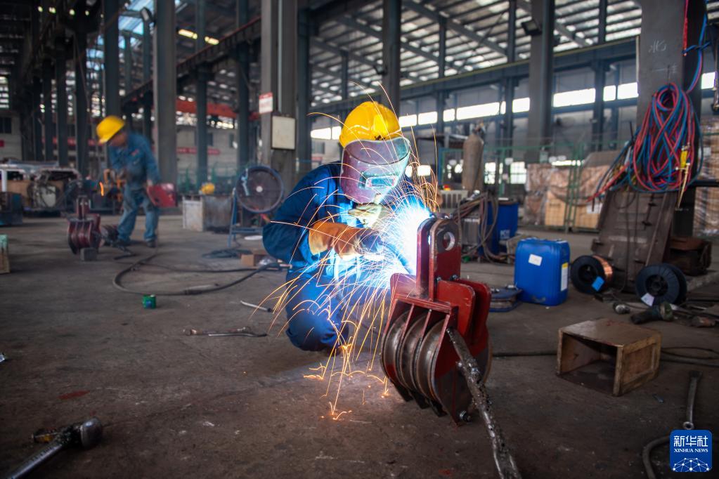 6月2日,在位于婁底經(jīng)開(kāi)區的湖南湘江電力建設集團,工人在生產(chǎn)液壓打樁錘配件。