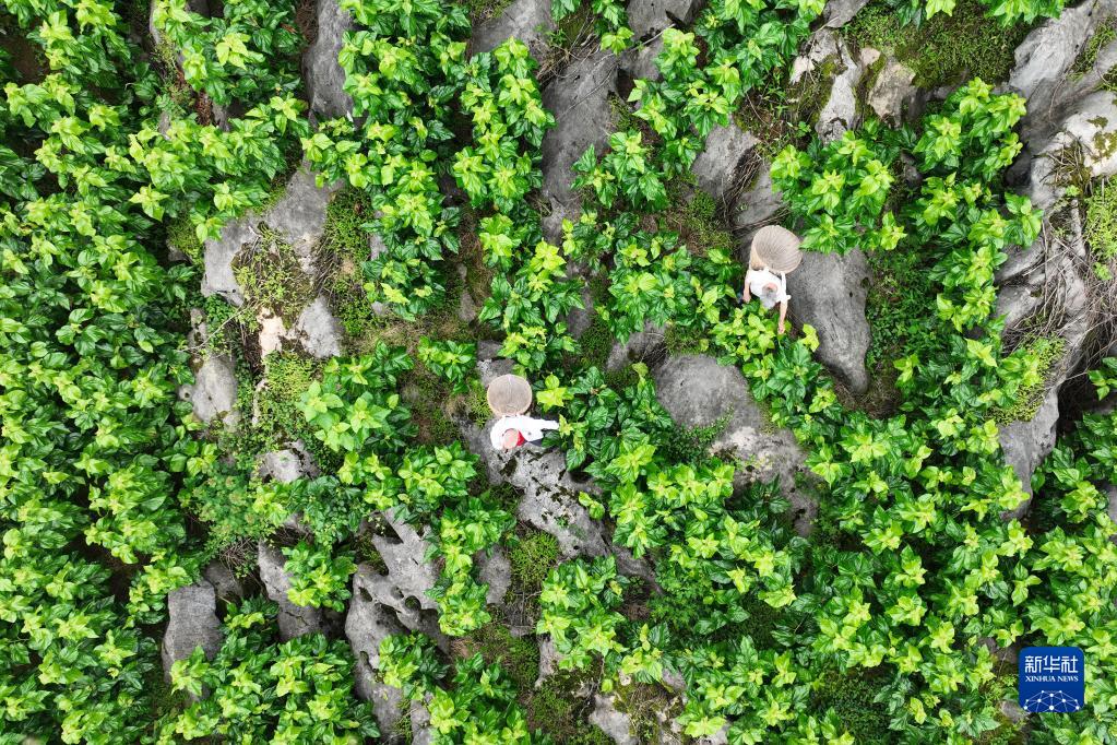 6月2日,重慶市黔江區濯水鎮雙龍村村民在石漠化蠶?;毓茏o桑樹(shù)(無(wú)人機照片)。