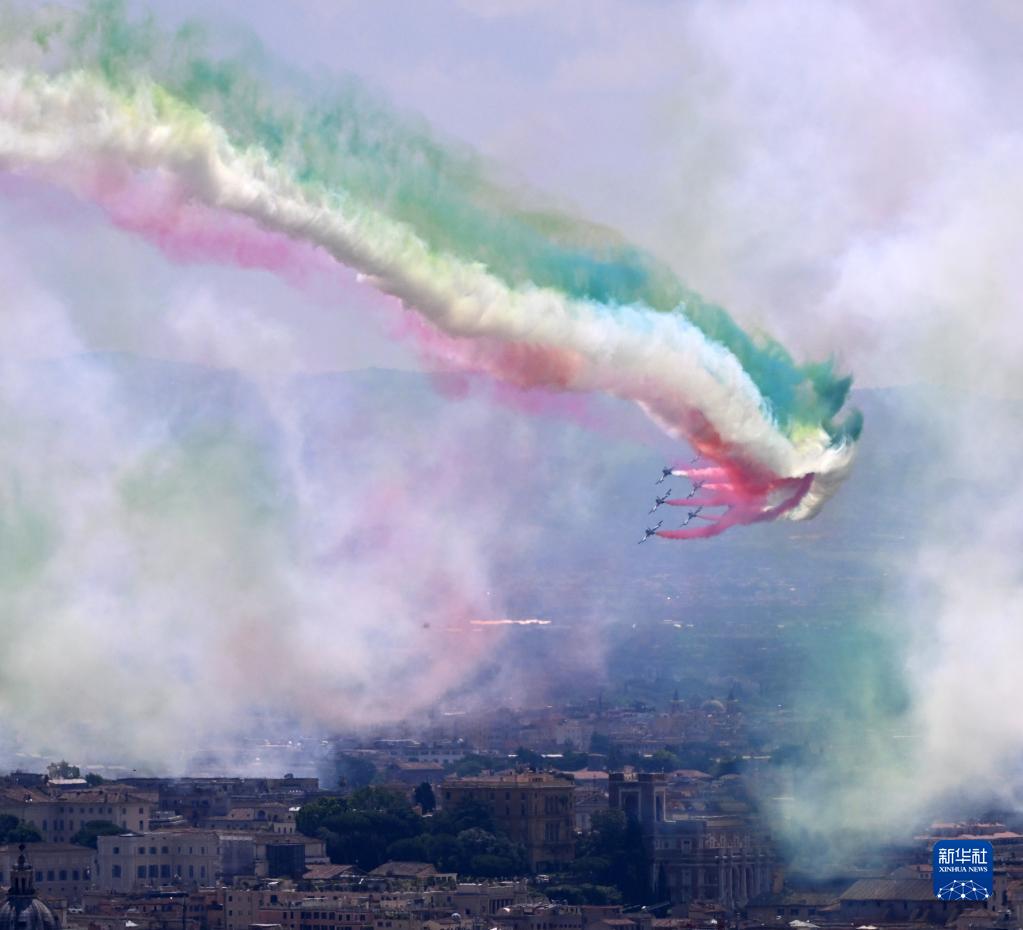 6月2日,意大利“三色箭”特技飛行表演隊在羅馬參加共和國日慶祝儀式。