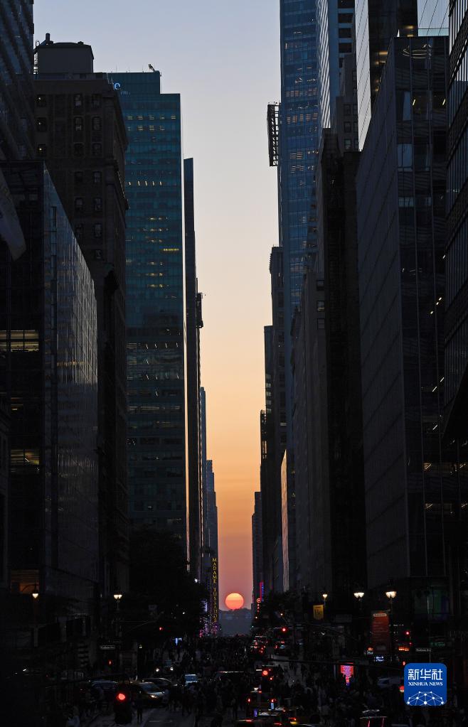 當日,紐約出現“曼哈頓懸日”景觀(guān)?!奥D懸日”是紐約市標志性景觀(guān),每年5月和7月出現兩次,指日落時(shí)太陽(yáng)正好出現在曼哈頓東西向街道正上方、似乎懸在兩側高樓大廈之間的戲劇性畫(huà)面。