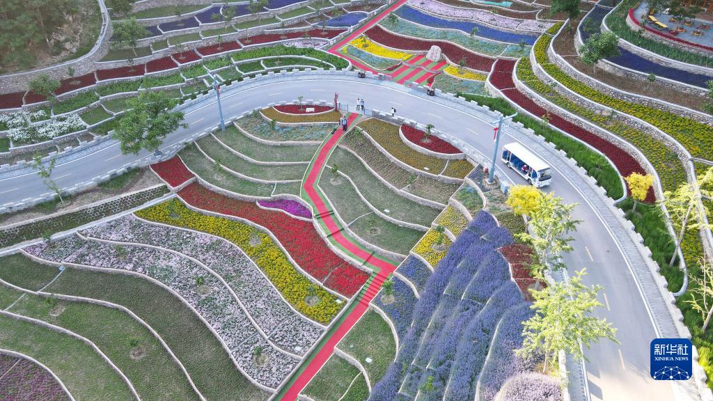 這是梨樹(shù)溝休閑小鎮的花海梯田(6月2日攝,無(wú)人機照片)。