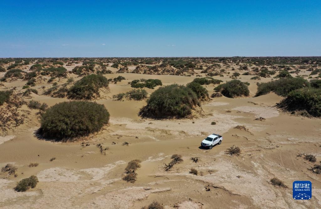 6月2日,額濟納旗文物保護中心工作人員在戈壁灘上巡護(無(wú)人機照片)。