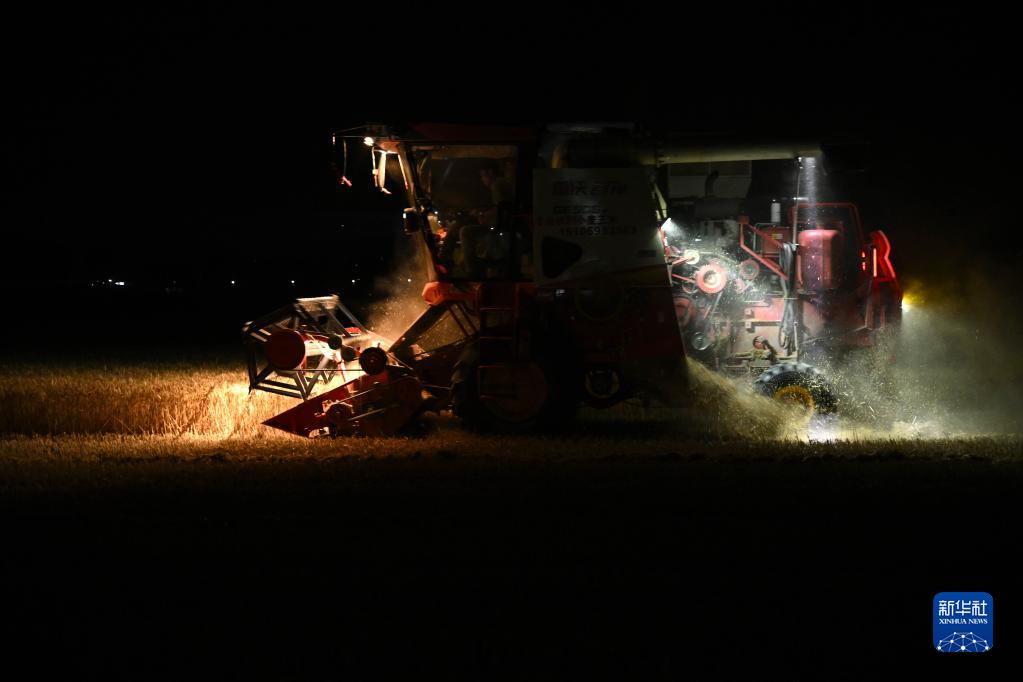 6月2日夜晚,在阜陽(yáng)市阜南縣苗集鎮的一處麥田,農機手駕駛收割機收割小麥。