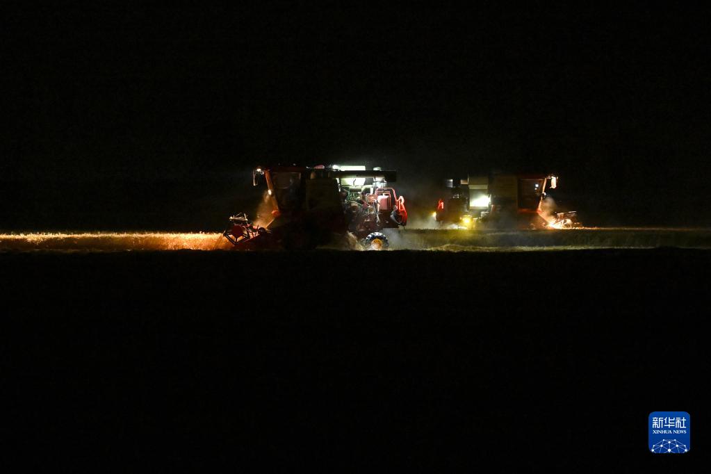 6月2日夜晚,在阜陽(yáng)市阜南縣苗集鎮的一處麥田,農機手駕駛收割機收割小麥。