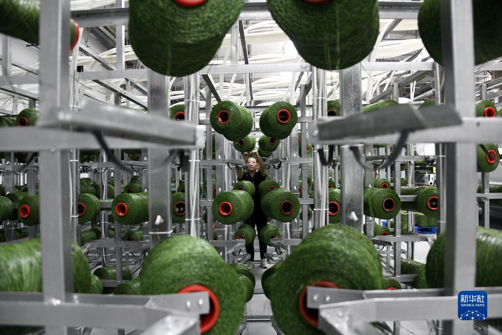 6月2日,在山東省樂(lè )陵市泰山體育產(chǎn)業(yè)集團有限公司,工人在人造草坪智能化生產(chǎn)車(chē)間作業(yè)。