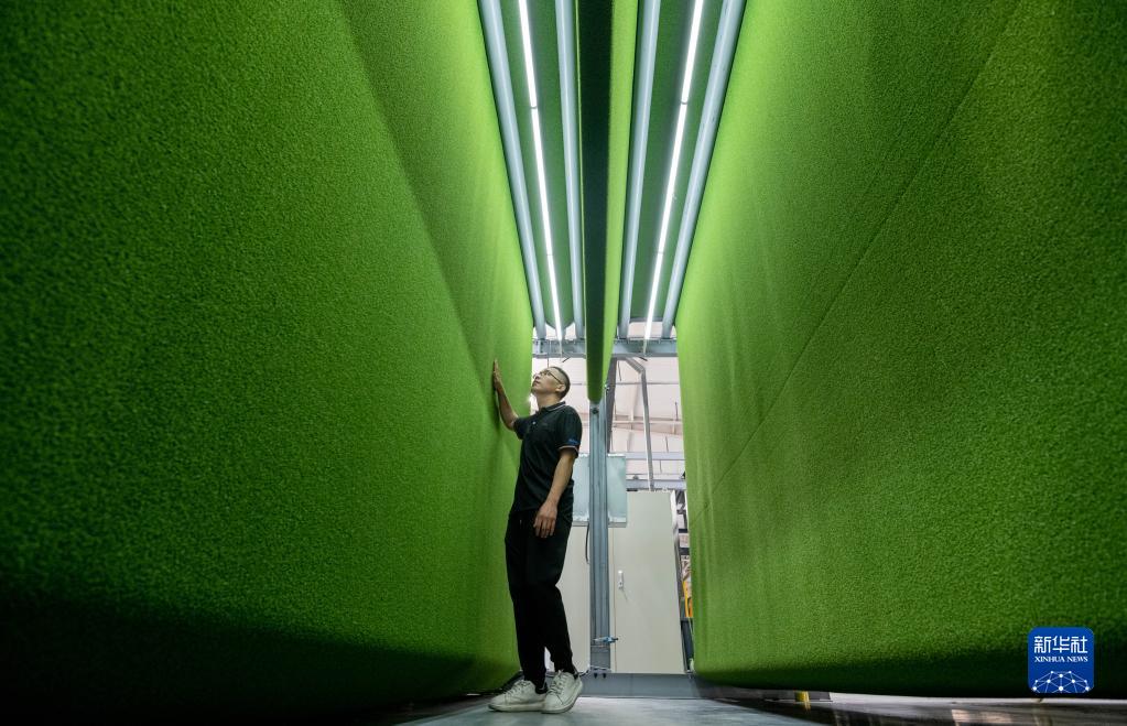 6月2日,在山東省樂(lè )陵市泰山體育產(chǎn)業(yè)集團有限公司人造草坪智能化生產(chǎn)車(chē)間,工人在檢測產(chǎn)品。