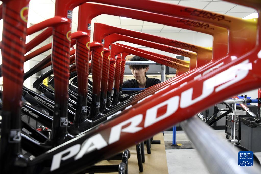 6月2日,在山東省樂(lè )陵市泰山瑞豹復合材料有限公司的碳纖維自行車(chē)生產(chǎn)車(chē)間,工人在檢測碳纖維車(chē)架。