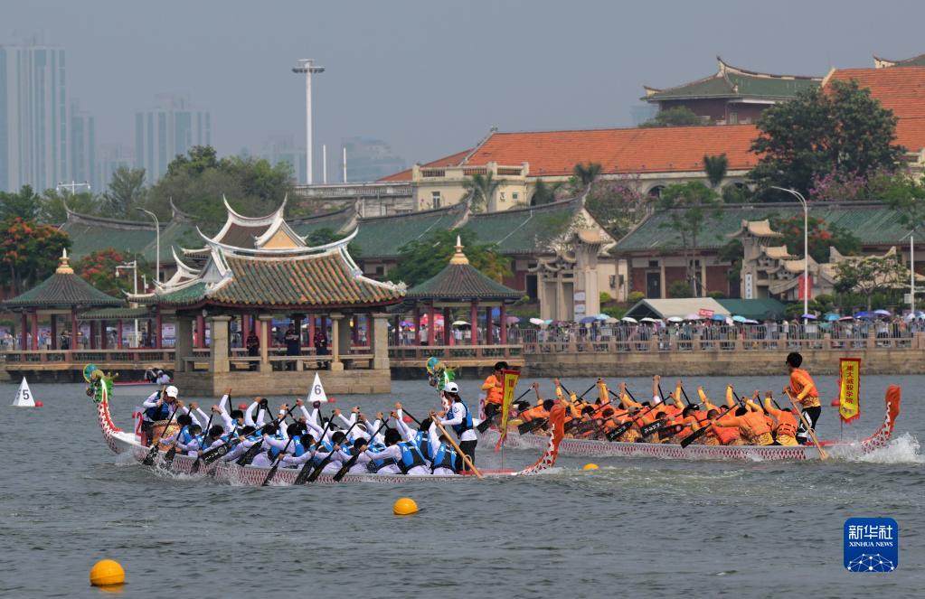 6月3日,在福建廈門(mén)集美龍舟池,來(lái)自海峽兩岸的龍舟隊競渡爭先。