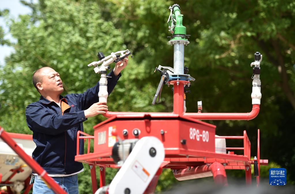 6月2日,在河北省石家莊市深澤縣一家農機生產(chǎn)企業(yè),工人對農業(yè)灌溉設備進(jìn)行檢查。