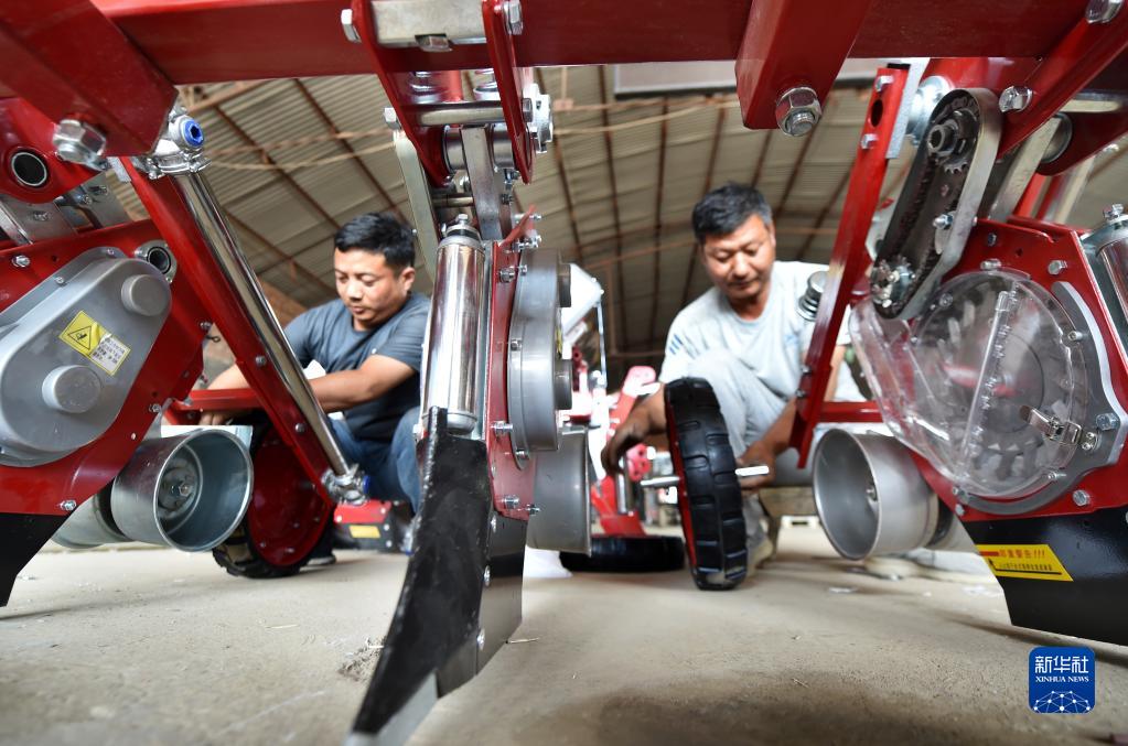 6月2日,在河北省石家莊市深澤縣一家農機銷(xiāo)售點(diǎn),工作人員安裝播種機。