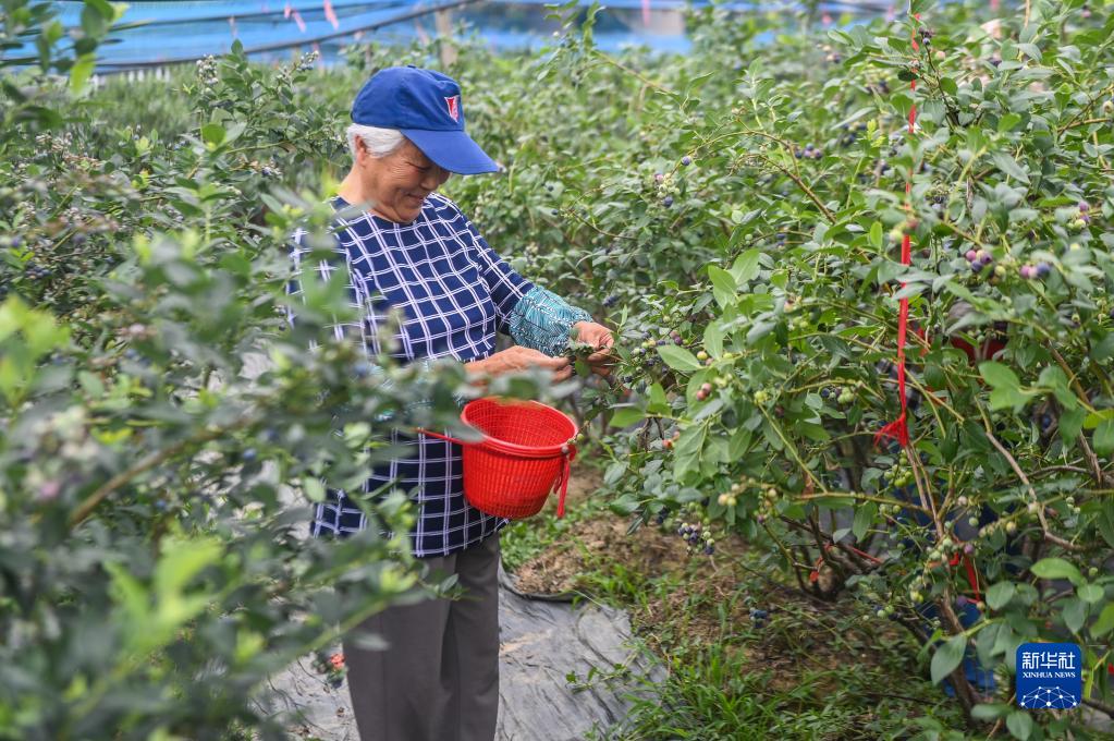 6月3日,在位于長(cháng)興縣虹星橋鎮譚家村的金藍家庭農場(chǎng)的藍莓種植區內,作為幫工的村民采摘成熟的藍莓。果蔬采摘給當地村民帶來(lái)了不少收入。