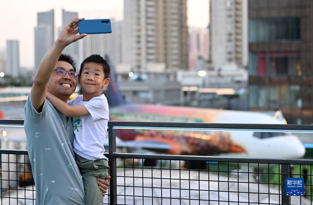 在天津市和平區金街商圈的“印象城”,家長(cháng)抱著(zhù)孩子合影留念(6月2日攝)。