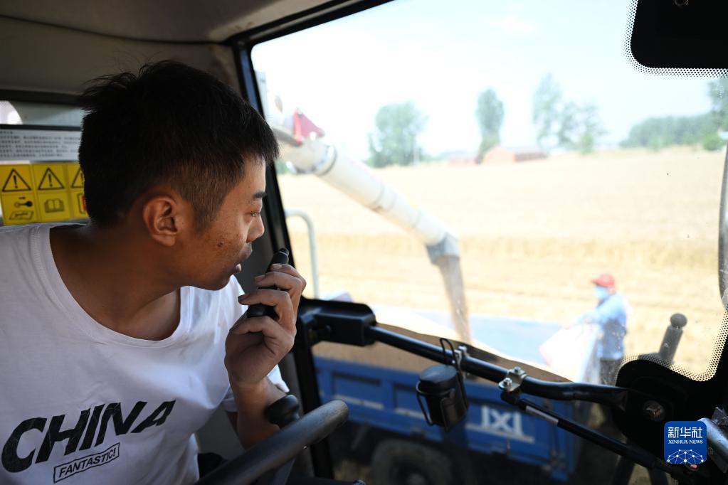 6月2日,在安徽省阜陽(yáng)市阜南縣許堂鄉劉崗村,董斐斐駕駛收割機將收割的小麥裝車(chē)。