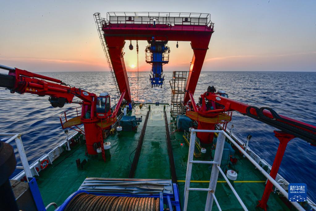 “探索一號”科考船行駛在南海西北陸坡一號、二號沉船遺址海域(5月24日攝)。