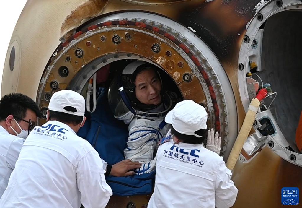 6月4日,神舟十五號載人飛船返回艙在東風(fēng)著(zhù)陸場(chǎng)成功著(zhù)陸,神舟十五號載人飛行任務(wù)取得圓滿(mǎn)成功。這是航天員費俊龍出艙時(shí)刻。新華社記者 賀書(shū)琛 攝
