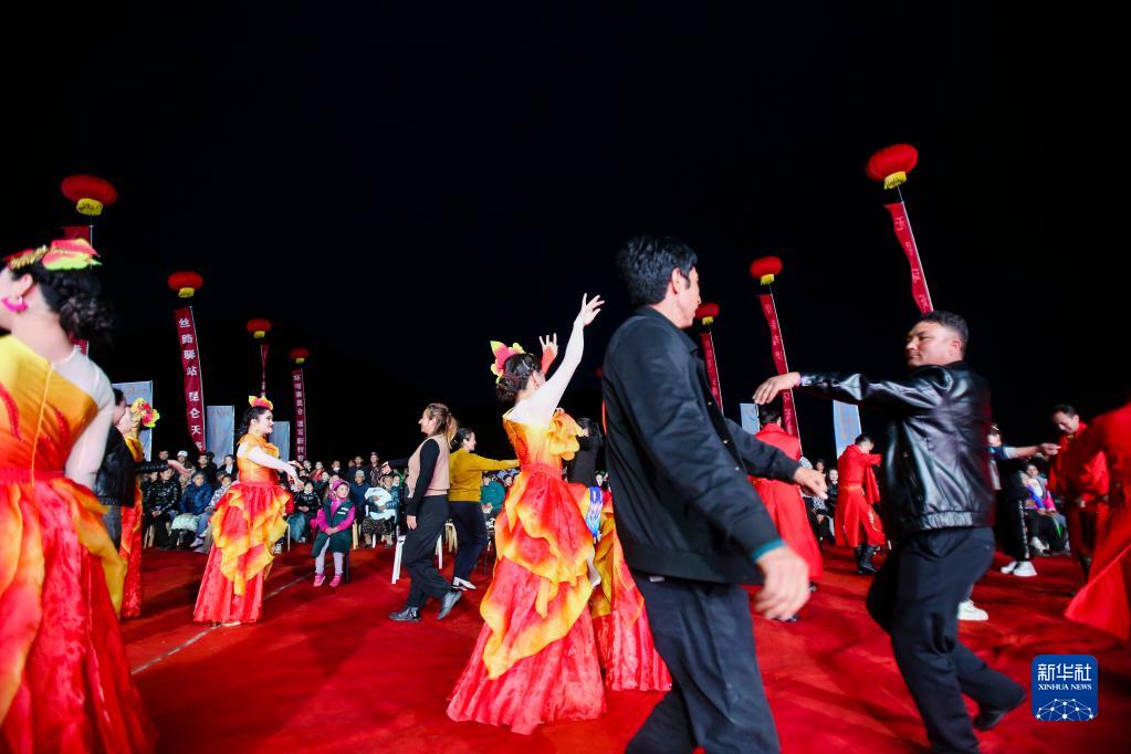 5月30日,環(huán)塔拉力賽昆侖天路賽段篝火晚會(huì )在新疆和田策勒縣板蘭格景區舉辦,這是游客和舞蹈演員共跳麥西來(lái)甫。