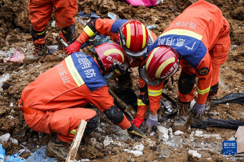 6月4日,消防救援人員在樂(lè )山市金口河區永勝鄉鹿兒坪石板溝發(fā)生高位山體垮塌現場(chǎng)清理檢查。