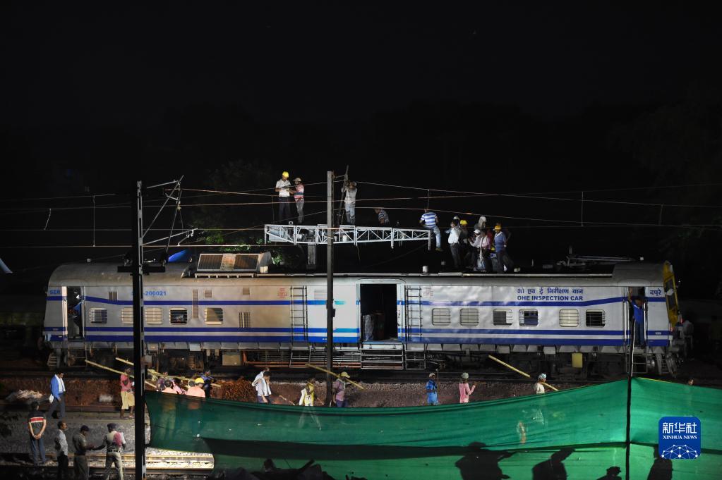 6月4日,救援人員在印度奧迪沙邦巴拉索爾地區的列車(chē)脫軌相撞事故現場(chǎng)工作。