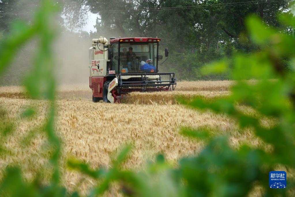 6月5日,聯(lián)合收割機在河北省沙河市下鄭村收割小麥。