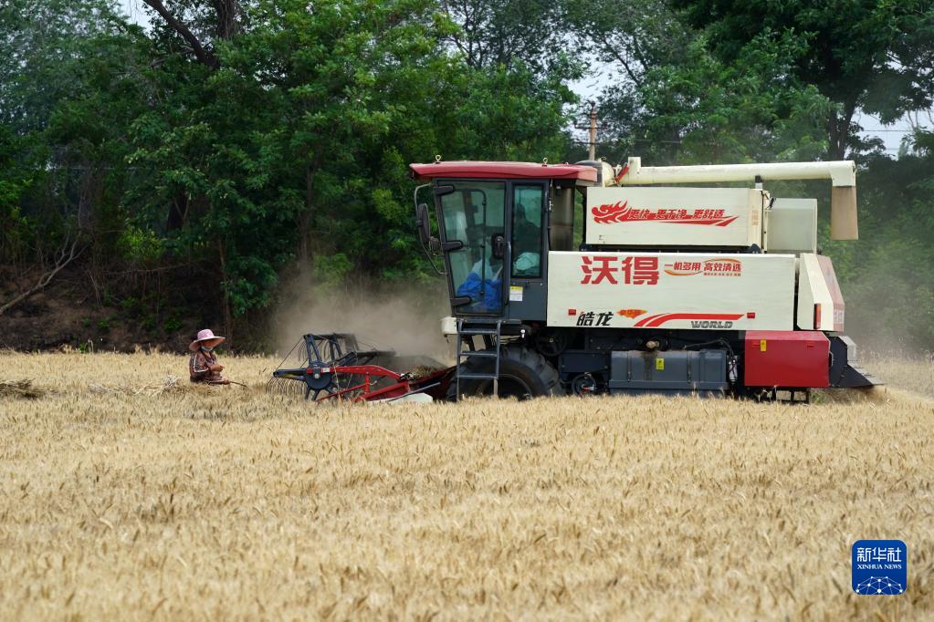 6月5日,聯(lián)合收割機在河北省沙河市下鄭村收割小麥。