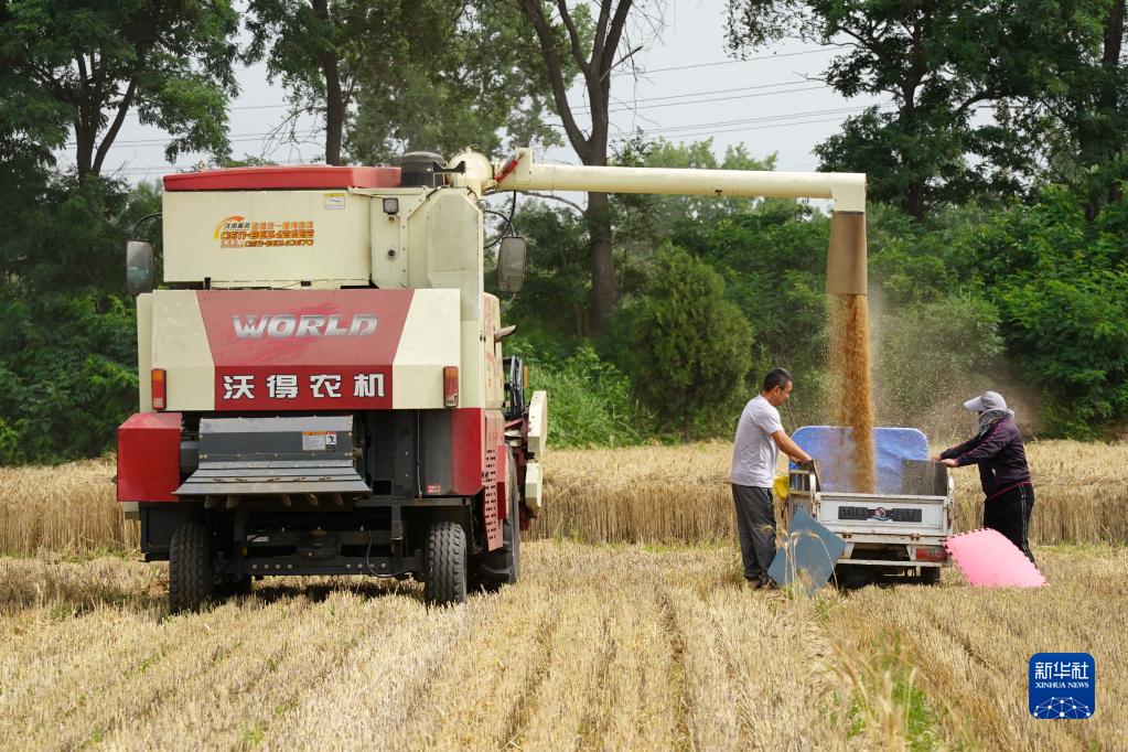 6月5日,農民在河北省沙河市下鄭村的麥田里將收獲的小麥裝車(chē)。