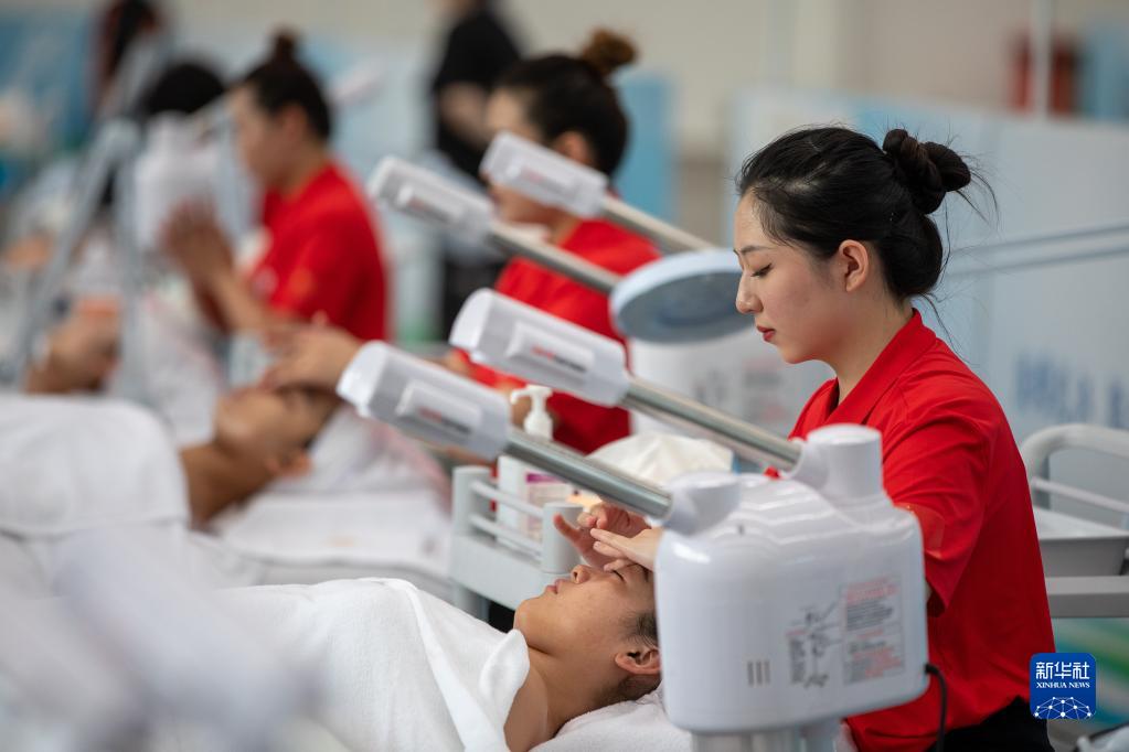 6月5日,在黑龍江省第一屆職業(yè)技能大賽現場(chǎng),選手在參加美容比賽。